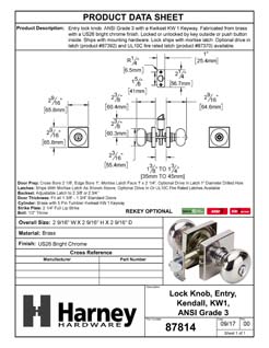 Product Data Specification Sheet Of A Door Knob Set Keyed / Entry Function Contemporary Style Kendall Collection - Chrome Finish - Product Number 87814