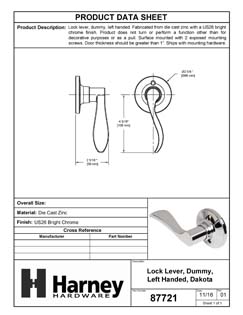 Product Data Specification Sheet Of A Door Lever Inactive / Dummy Function Dakota Collection - Chrome Finish - Product Number 87721