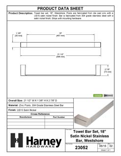 Product Data Specification Sheet Of A Towel Bar, 18 In., Westshore Bathroom Hardware Set - Satin Nickel Finish - Product Number 23052