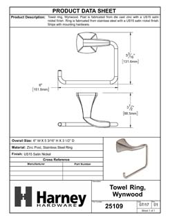 Product Data Specification Sheet Of A Towel Ring, Wynwood Bathroom Hardware Set - Satin Nickel Finish - Product Number 25109